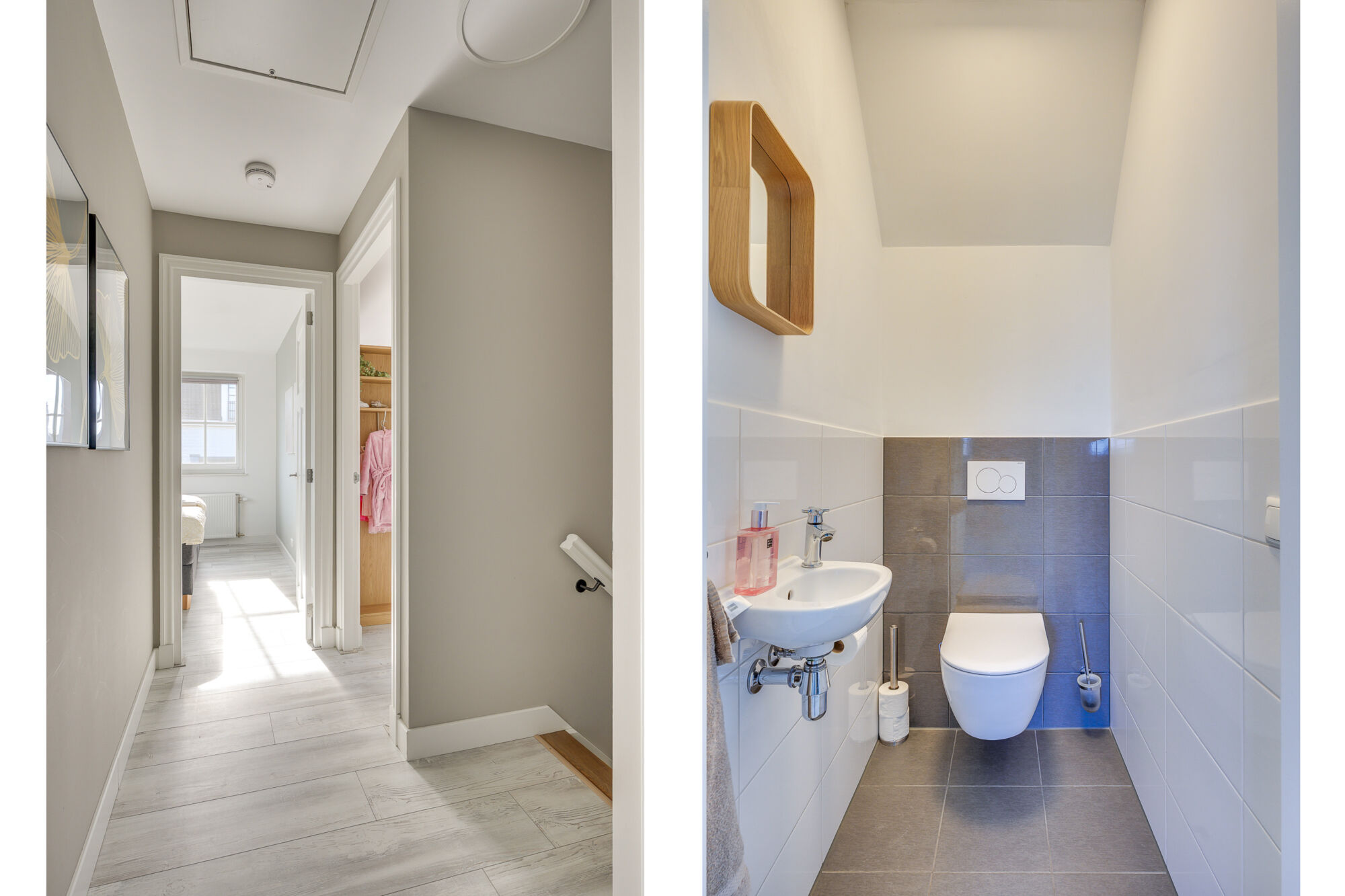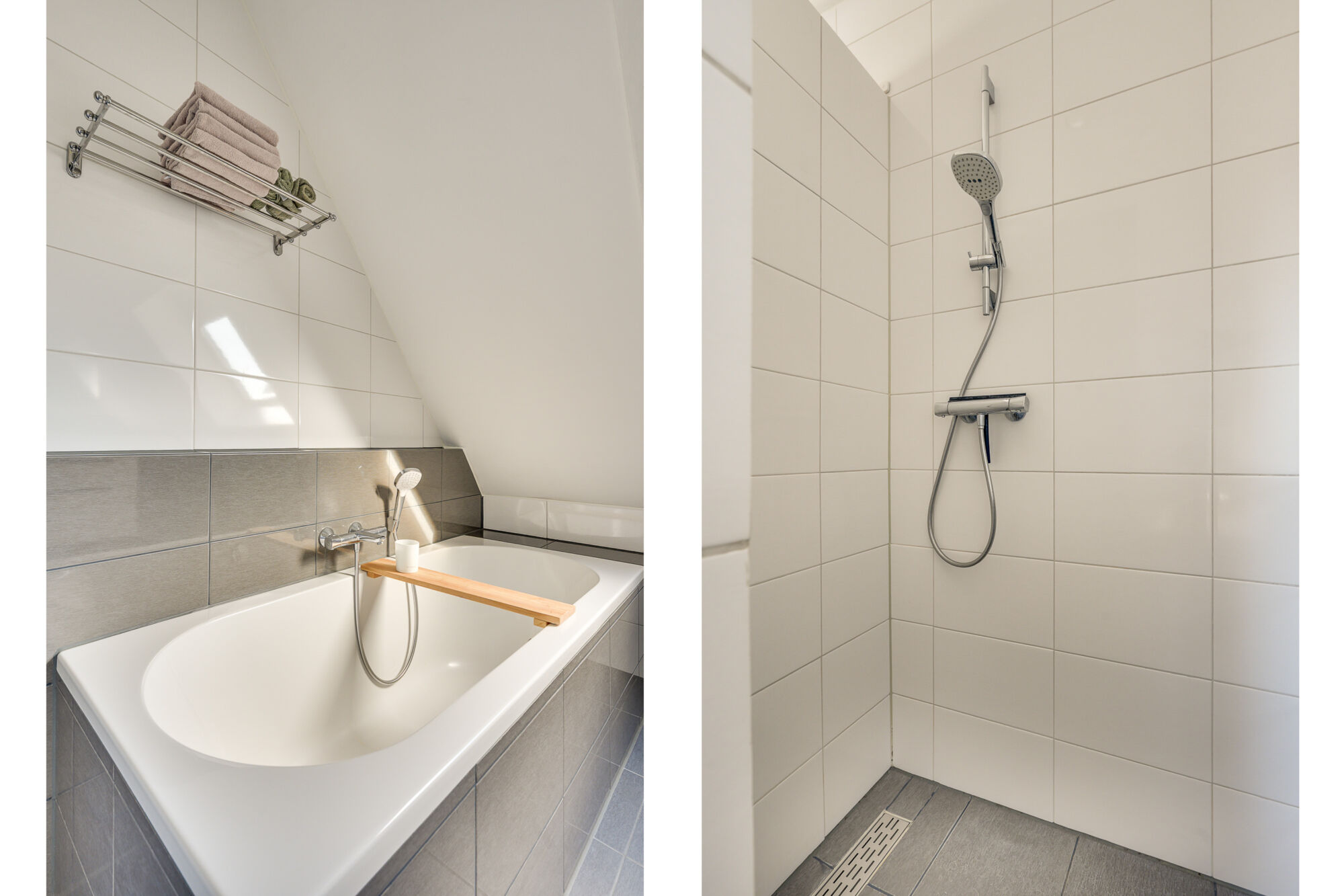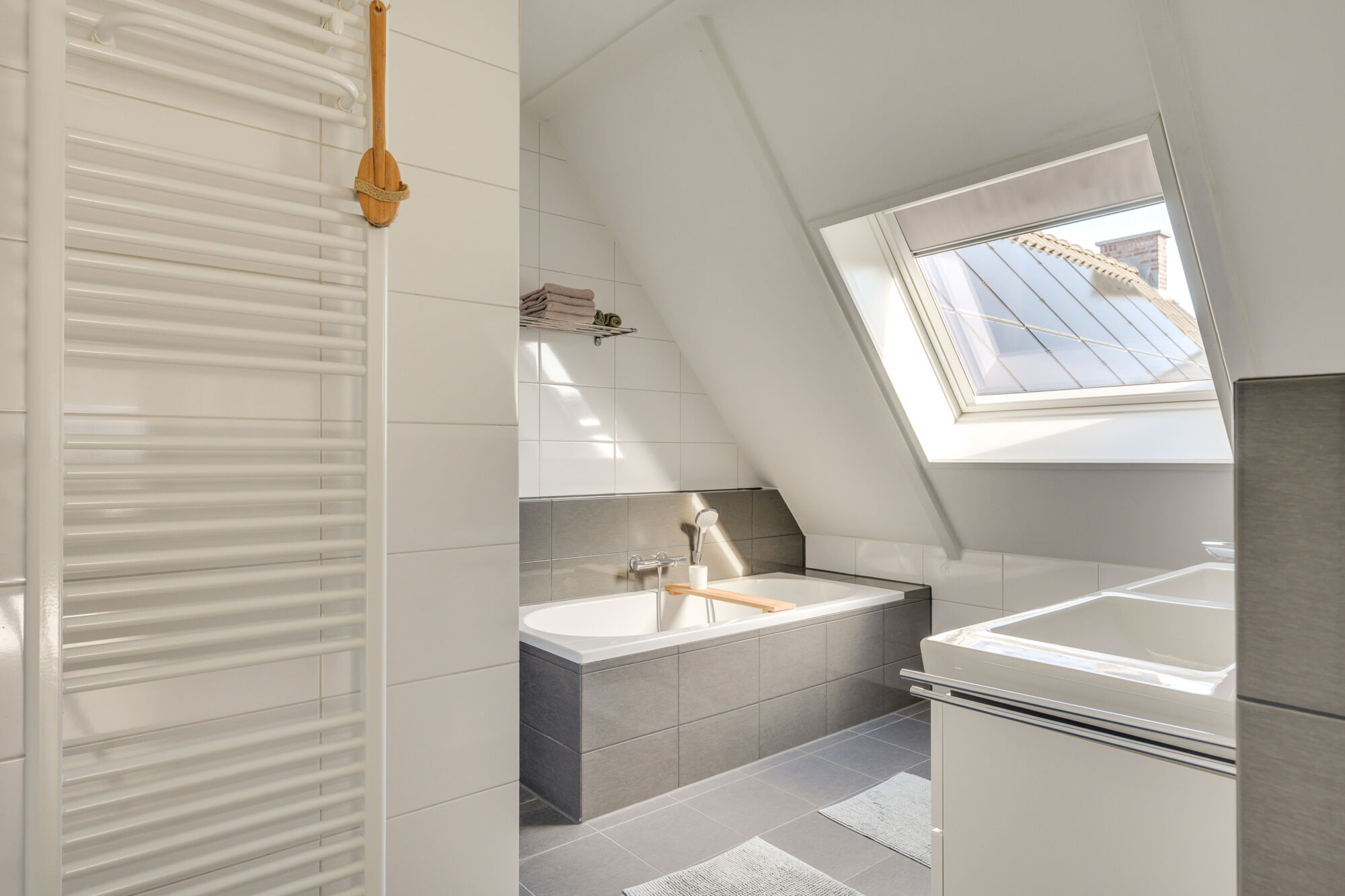 De moderne badkamer is volledig betegeld en stijlvol afgewerkt. De ruimte is ingericht met een dubbele wastafel met bijpassend meubel, een comfortabel ligbad en een ruime inloopdouche. Op de overloop van de eerste verdieping, direct naast de badkamer, bevindt zich een separaat toilet met fontein.