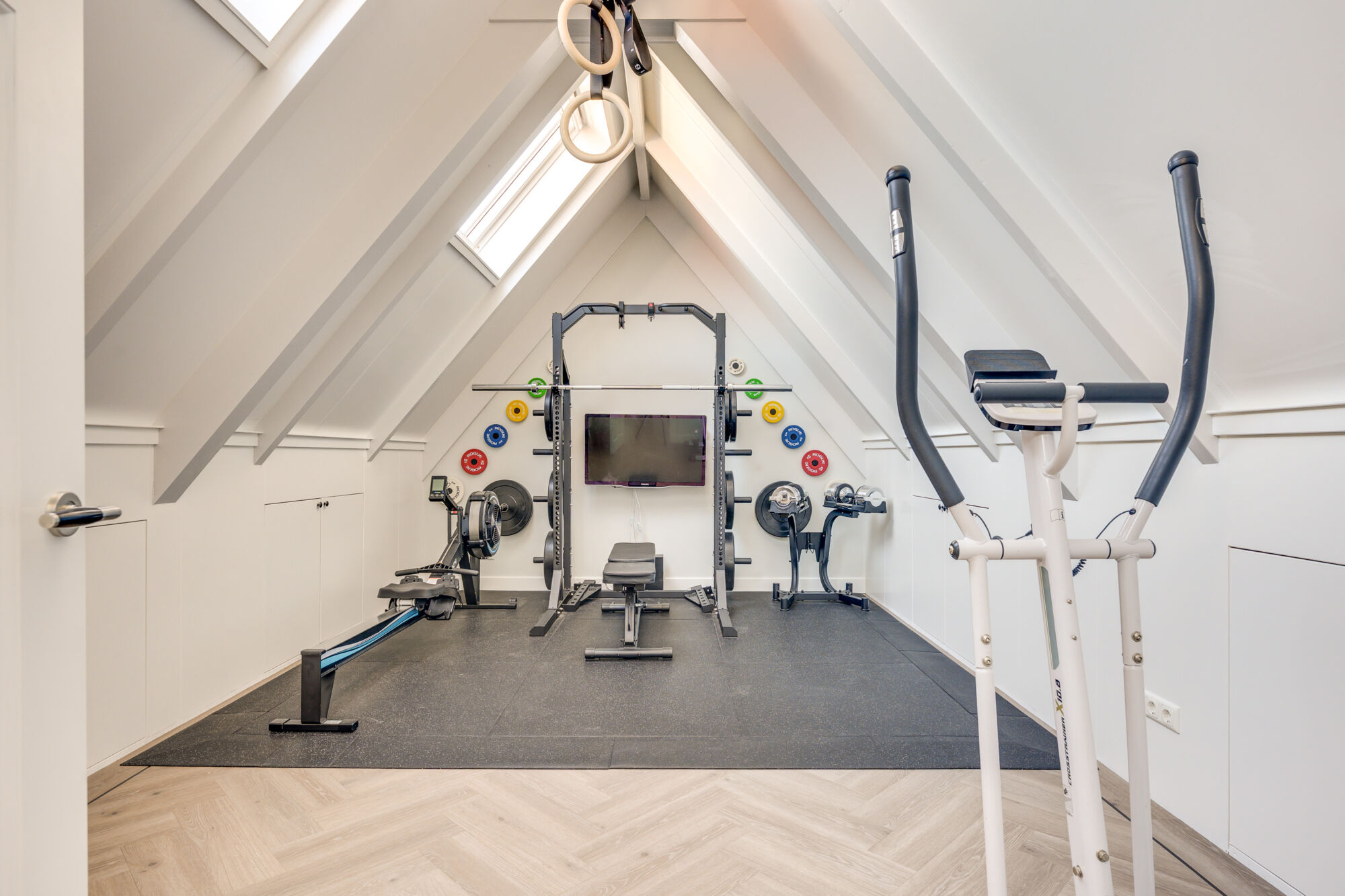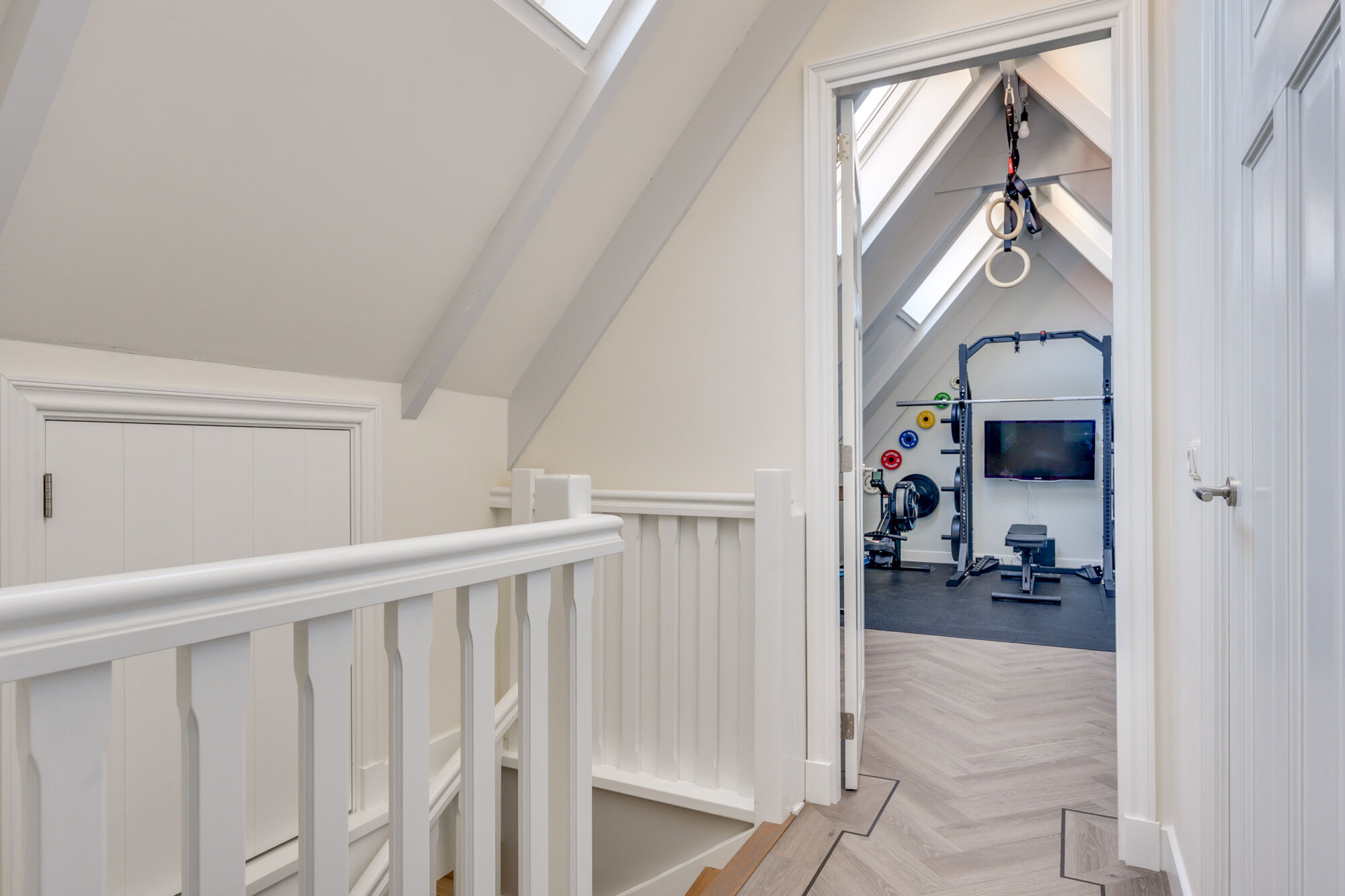 Aan de linkerzijde van de woning bevindt zich de tweede hal van de woning. Vanuit hier kunt u het tweede gedeelte van de bovenverdieping bereiken. Als u naar boven loopt, komt u uit op de overloop waaraan 2 slaapkamers en een walk-in closet zijn gelegen. De grote slaapkamer wordt momenteel gebruikt als sportkamer. De tweede slaapkamer is tevens een sfeervolle en volwaardige slaapkamer.
