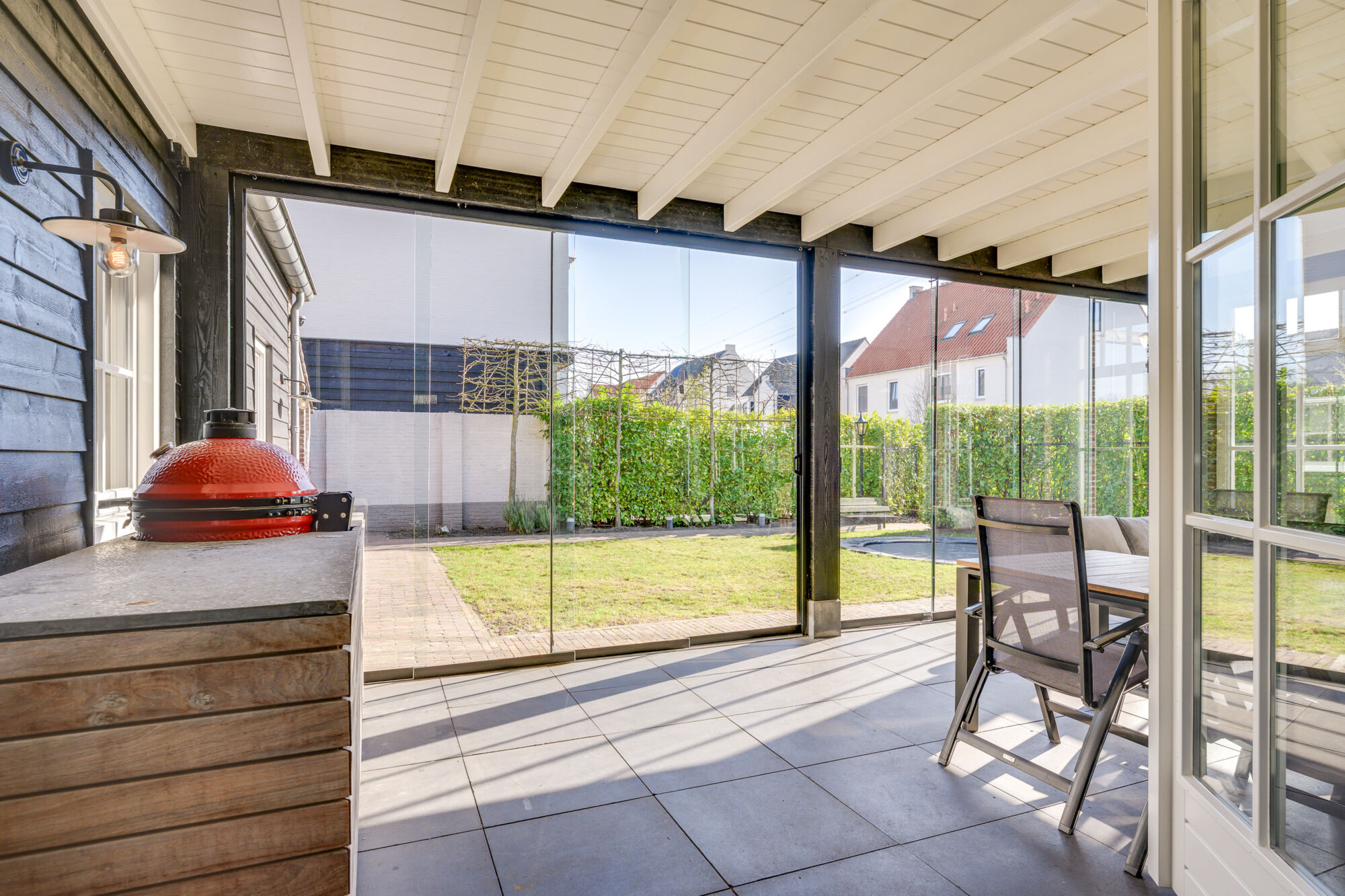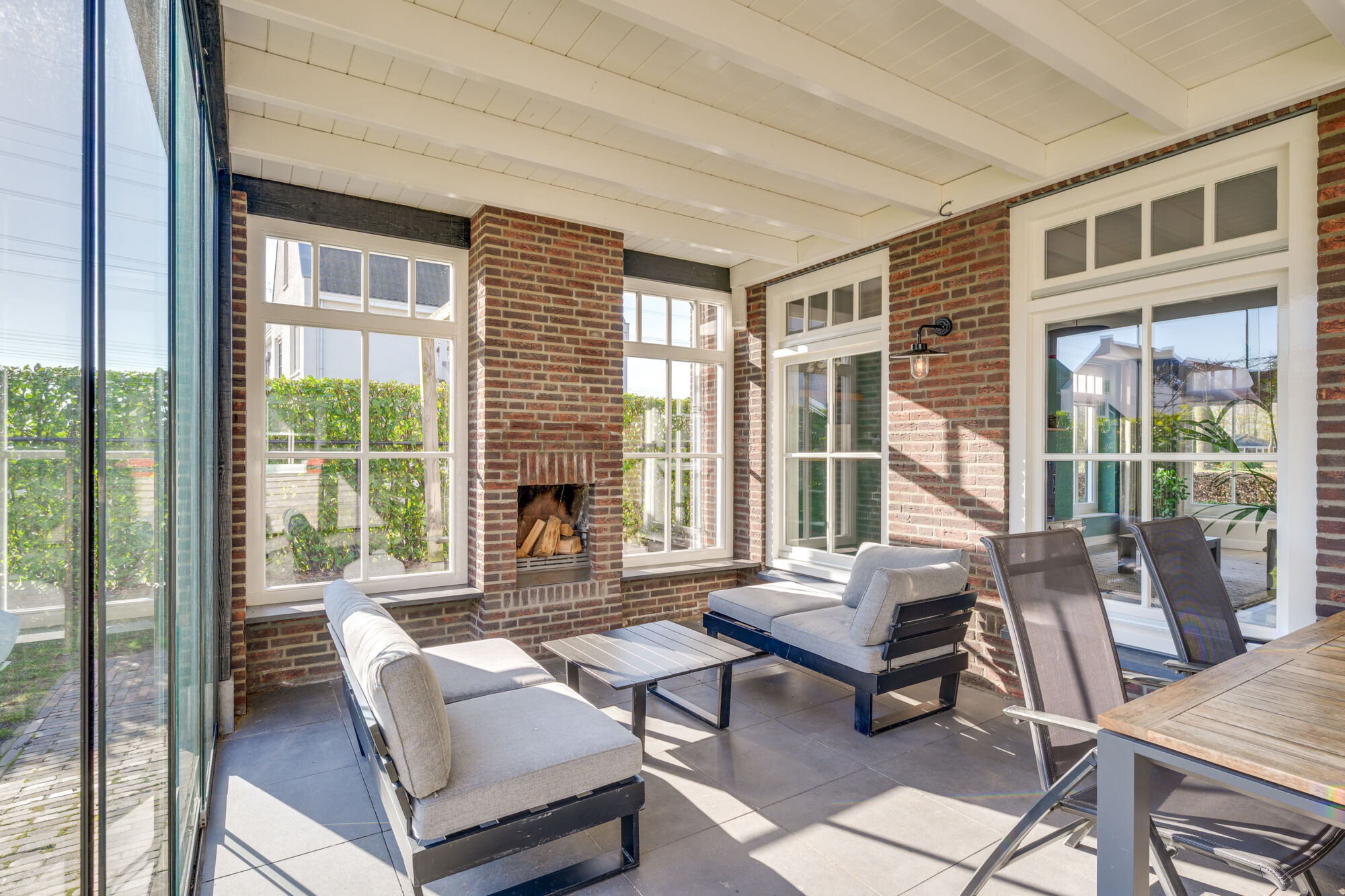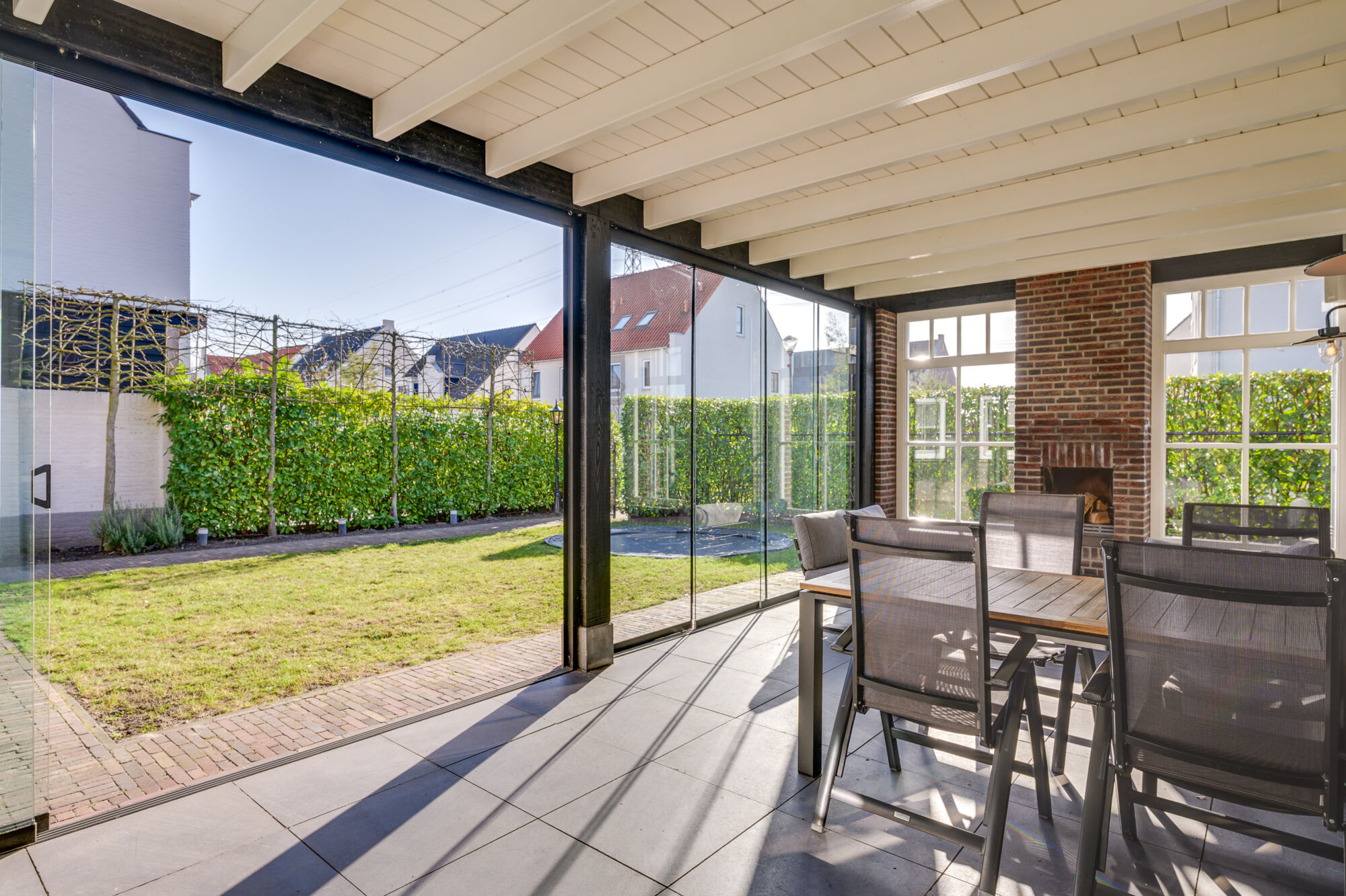Achter de woning bevindt zich een sfeervol overdekt terras met een glazen schuifpui, waar u in alle rust kunt genieten van het buitenleven. De aanwezigheid van een open haard zorgt voor