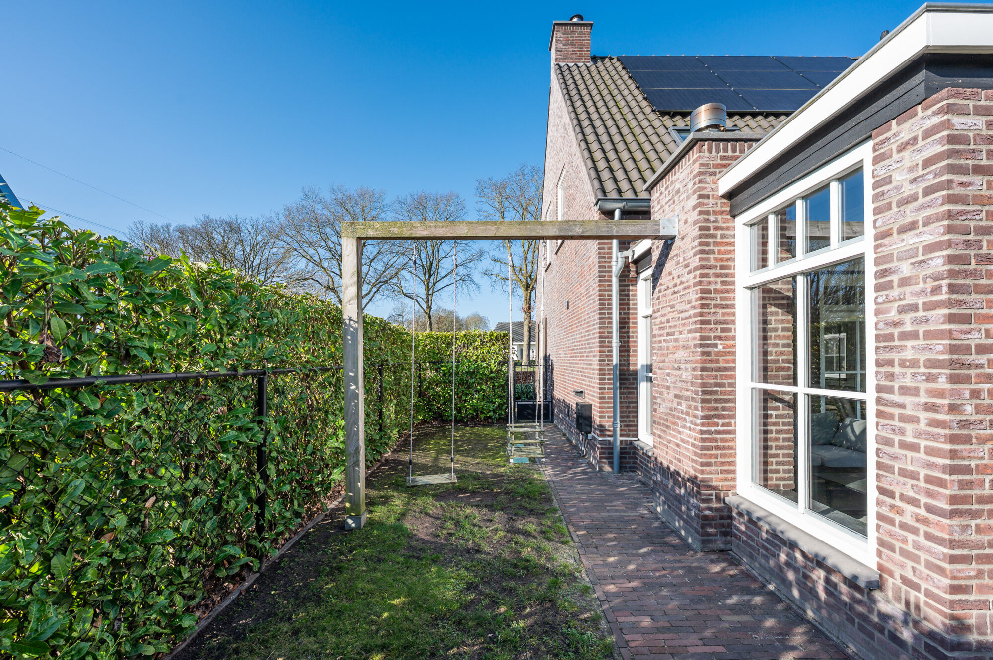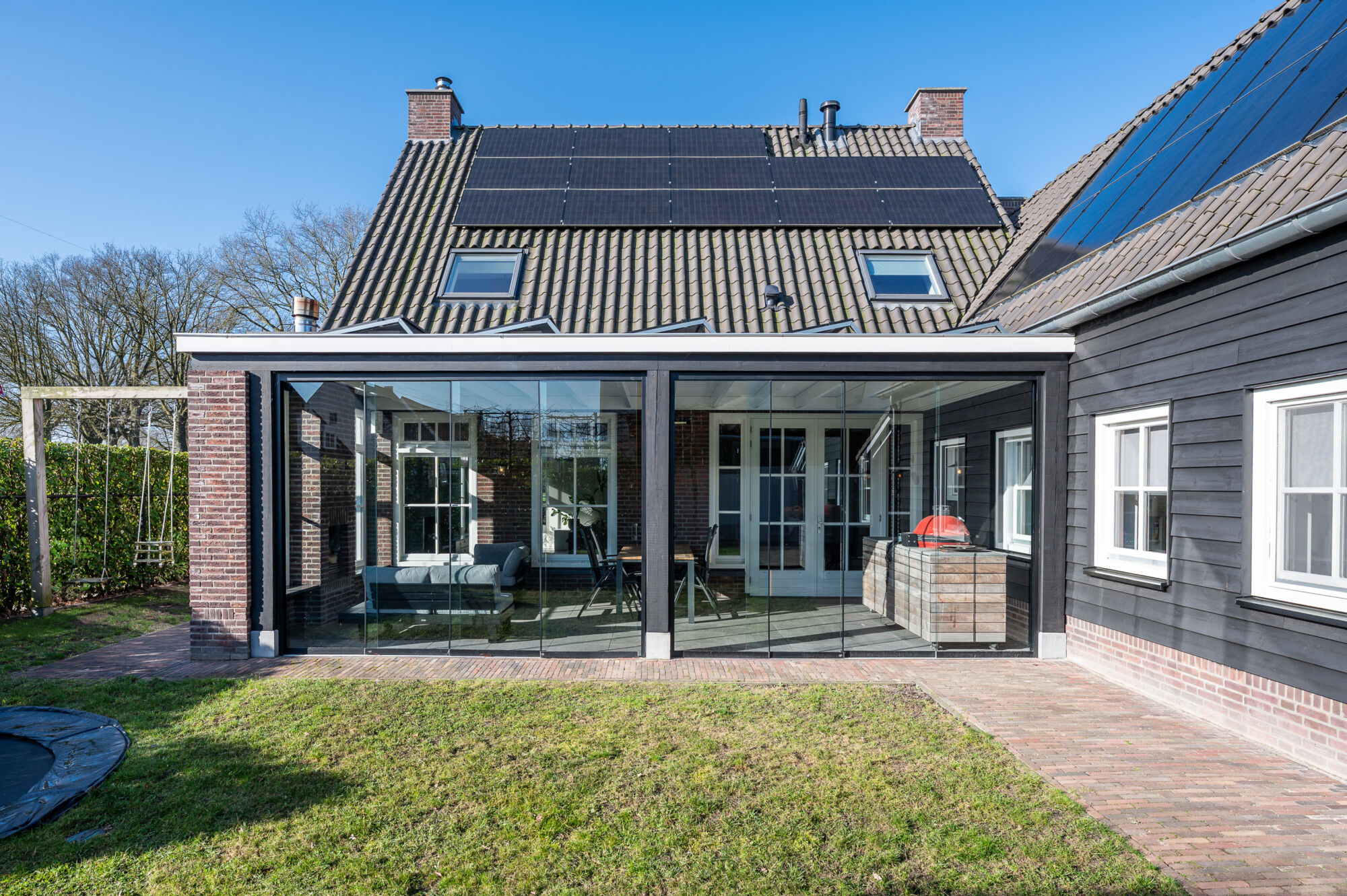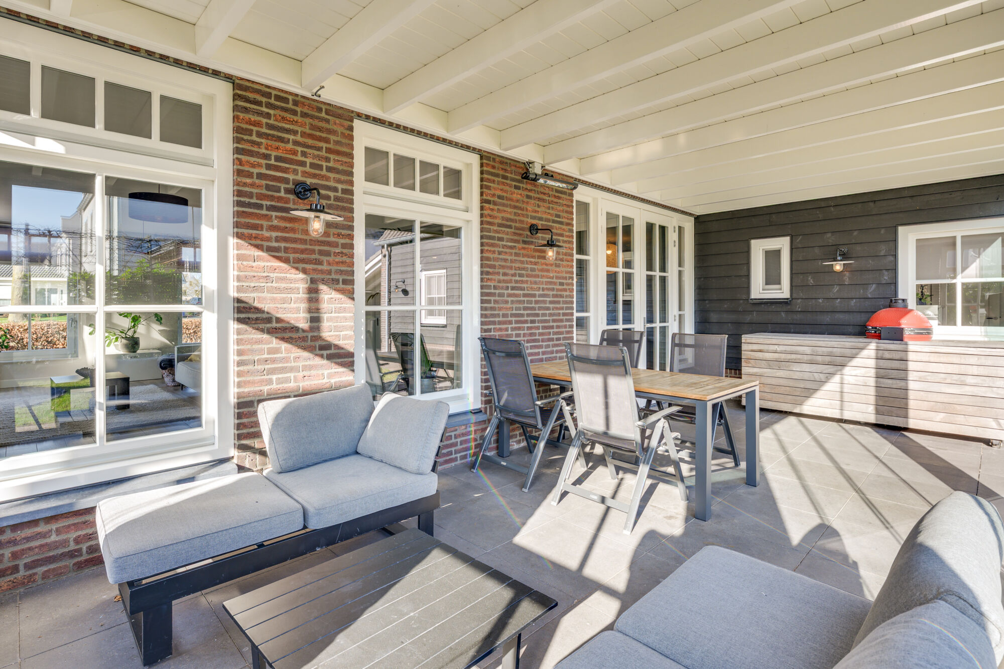 Achter de woning bevindt zich een sfeervol overdekt terras met een glazen schuifpui, waar u in alle rust kunt genieten van het buitenleven. De aanwezigheid van een open haard zorgt voor
