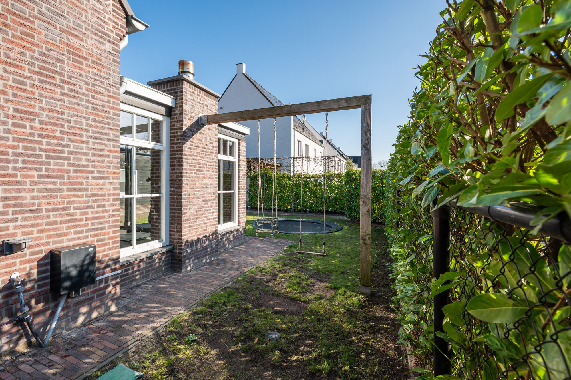 De tuin is volledig omheind en beschikt over een praktische achterom. Voor het opbergen van tuinmaterialen en fietsen is er een aangebouwde berging aanwezig.