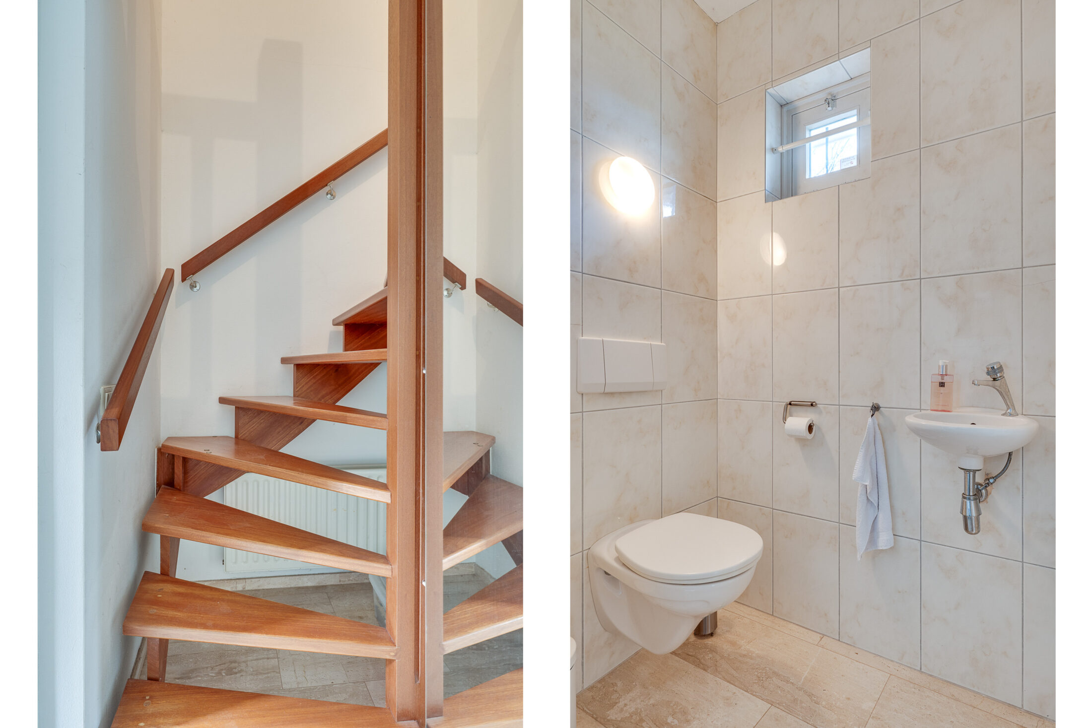 Aan deze entree zijn gelegen de toiletruimte voorzien van strak tegelwerk, een wandcloset en fonteintje, de trapopgang naar de eerste verdieping, garderobe en de toegang tot de woonkamer met open keuken.