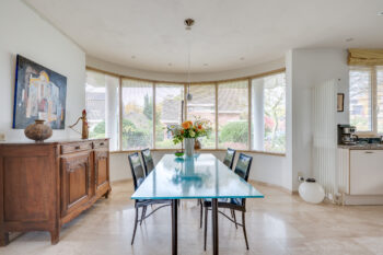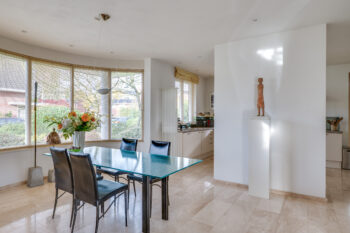 Aan de voorzijde van de woning bevindt zich de dinerruimte welke in de ronding aan de voorzijde van de woning gesitueerd is, deze dinerruimte biedt derhalve een prachtig uitzicht over de rustige en groene woonstraat. Deze dinerruimte staat in verbinding met de open keuken aan de linkerzijde van de woning en achter deze dinerruimte heeft u de gelegenheid een fijne thuiswerkplek of bijvoorbeeld een vitrinekast te positioneren.