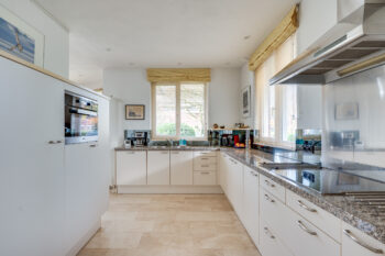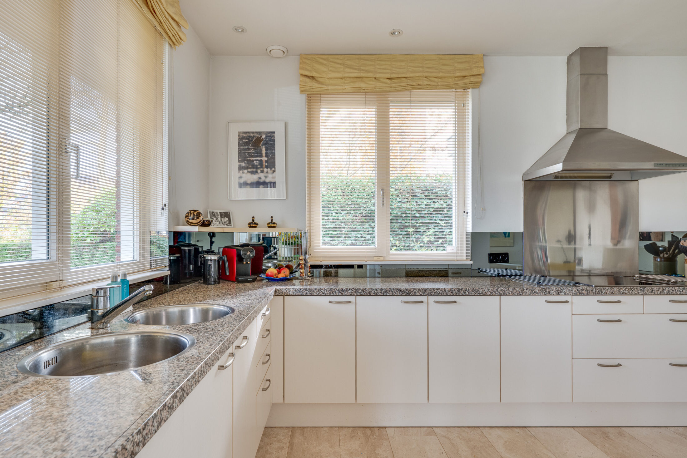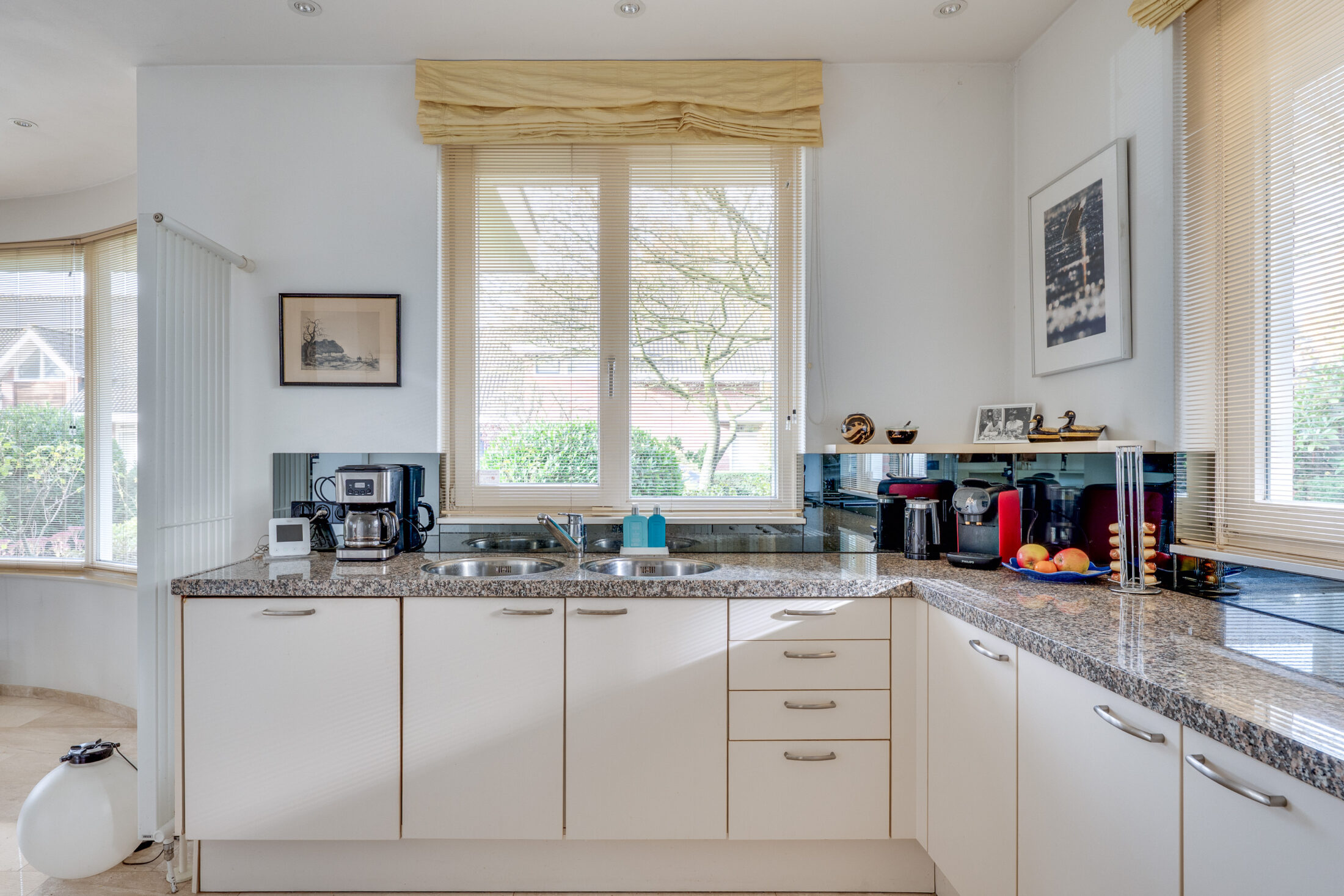Aan de linkerzijde van deze grote woning bevindt zich de open keuken. Deze keuken wordt gedeeltelijk afgescheiden middels een wand waartegen de keuken geplaatst is. Aan de overzijde bevindt zich in hoekopstelling tevens het werkblad van deze fijne keuken. Aan inbouwapparatuur treffen we: