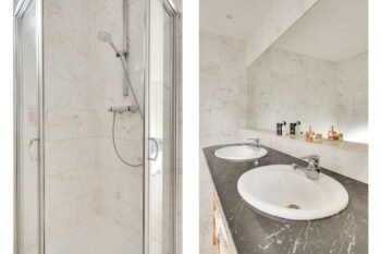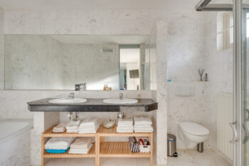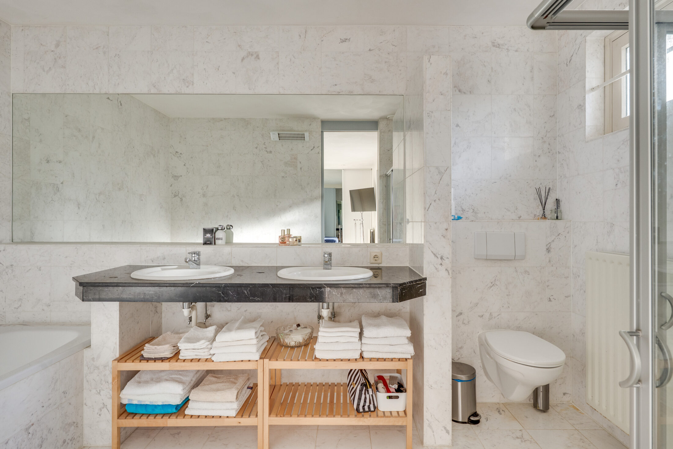 Vanuit deze slaapkamer bereiken we de en suite gelegen badkamer, voorzien van strak tegelwerk, natuurlijke ventilatie, vloerverwarming en een fijne oppervlakte van 9 m². Aan sanitair treffen we een ligbad, dubbele wastafel in meubel, wandcloset en een inloopdouche.