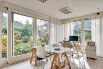 Aan de achterzijde van de woning bevindt zich een aangebouwde kantoor-/praktijkruimte, voorzien van een schuifpui en grote raamkozijnen rondom is dit een zeer geschikte thuiswerkplek, hobbyruimte of een ruimte om bijvoorbeeld uw praktijk te gaan situeren. Ook is er vloerverwarming in deze ruimte aanwezig, alsook een sierradiator.