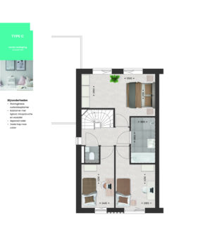 – Grote tweede verdieping, met meerdere indelingsmogelijkheden