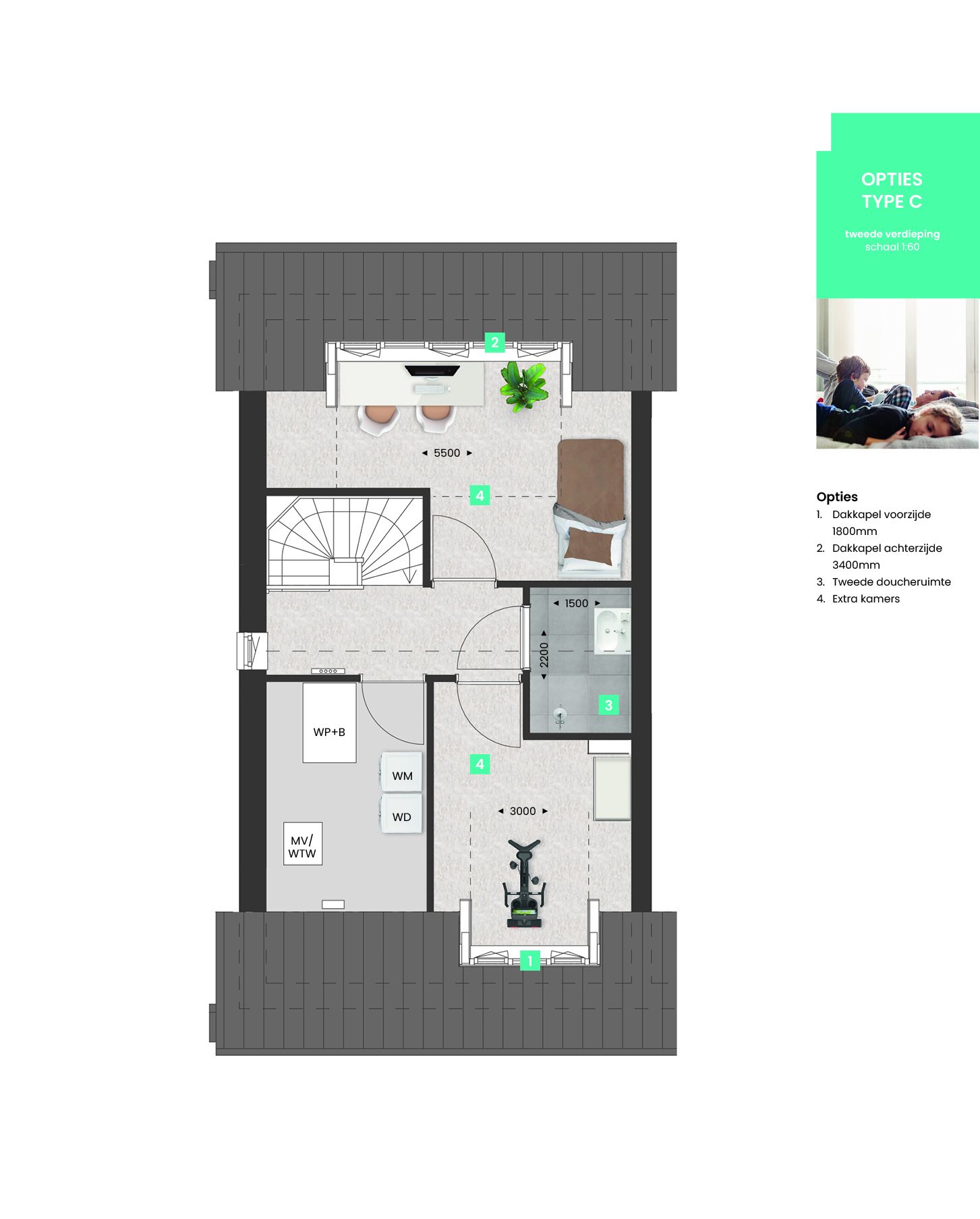 – Grote tweede verdieping, met meerdere indelingsmogelijkheden