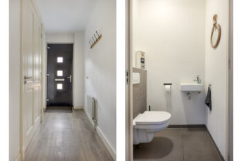 Bij binnenkomst betreedt u een ruime en lichte hal die direct een verzorgde indruk geeft. Hier vindt u de meterkast, het moderne toilet met fontein, de trapopgang naar de eerste verdieping en de toegang tot de sfeervolle woonkamer.