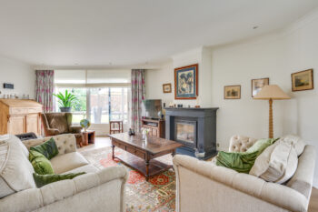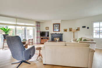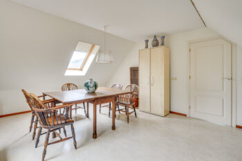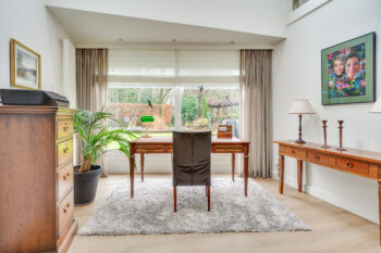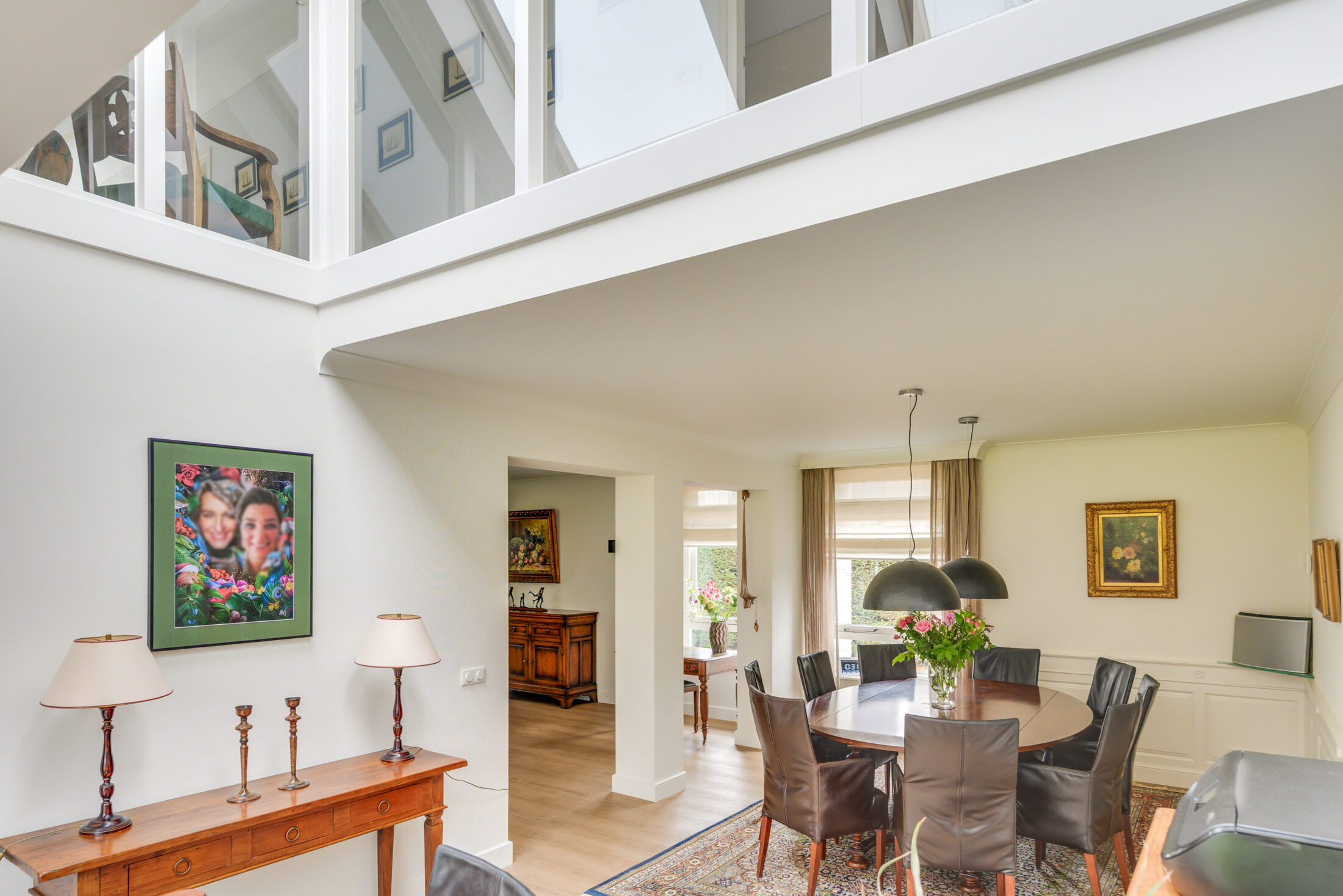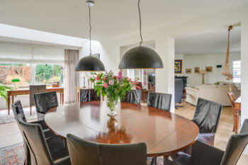 Links van de markante hal bereikt u de living welke opgedeeld is in een zit- en eetkamer, totaal circa 65 m². De zitkamer is fijn op de tuin gericht en beschikt over een fraaie gassfeerhaard. Wanden en plafond zijn voorzien van strak en modern stucwerk. Een brede schuifpui geeft toegang tot het terras in de achtertuin. De eetkamer staat in een halfopen verbinding waardoor u enigszins een separate eetkamer heeft, maar toch fijn contact met de zitkamer. Dit ziet u ook terug in de prachtige lichtinval in zowel de eet- als zitkamer. Niet in de minste plaats door de extra dakramen die in de schuinte van het dak liggen. Daarbij beschikt deze living over een airconditioningssysteem.