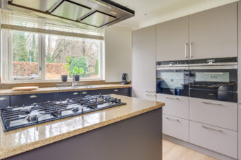 Ondanks dat er een eetkamer is, kunt u ook gezellig tafelen in deze woonkeuken zoals u op de afbeelding kunt zien. Deze woonkeuken is voor wat betreft ruimte perfect deze opstelling te hanteren. De keukeninrichting is in strak en neutraal kunststof uitgevoerd en beschikt over een granieten aanrechtblad. Natuurlijk voorzien van alle denkbare inbouwapparatuur zoals vaatwasser, kookplaat, afzuigkap, combi-oven, warmtelade en heteluchtoven. Daarnaast uiteraard ook een ruime hoeveelheid aan kastruimte.