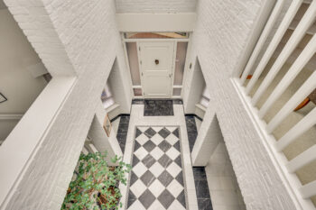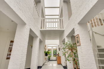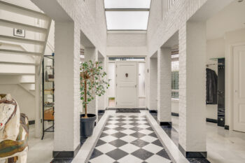 Via de grote oprijlaan bereikt u de elektrisch bedienbare poort naar de woning waar u royaal diverse auto’s kunt parkeren. Rechts gaat u naar de markante voorentree waar u de royale hal met prachtige vide bereikt.