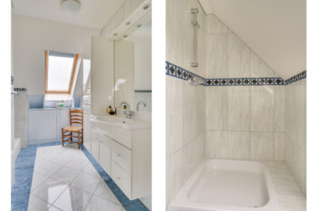 De tweede badkamer is ook stijlvol ingericht en afgewerkt; voorzien van inloopdouche, wastafelmeubel en het derde