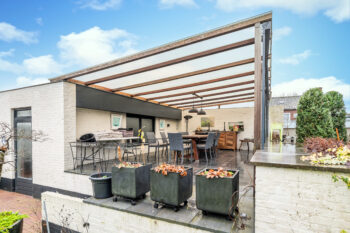 – Grote rondom gelegen achtertuin voorzien van diverse terrassen en op hoogte uitgevoerd;
