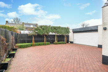 Aan de achterzijde van de oprijlaan en daarbij ook achter de woning gelegen bevindt zich de bijzonder royale, in spouw opgetrokken en geheel geïsoleerde garage met daarachter op verhoogd niveau een fijn en royaal overdekt terras voorzien van zonnescreens waar het heerlijk vertoeven is in de zomermaanden; beschut en met een groot gezelschap behoort tot de mogelijkheden. Deze garage is ruim van opzet en biedt de mogelijkheid om twee auto’s te parkeren.