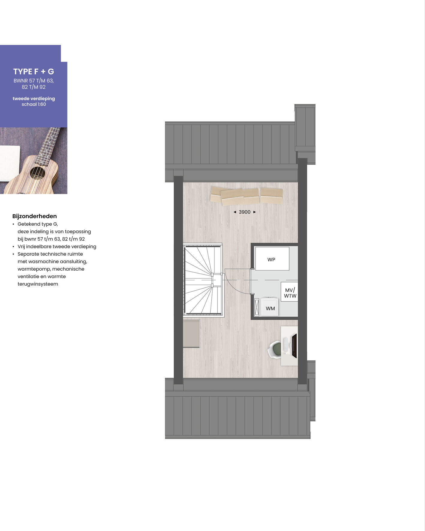 De woning heeft een praktische en doordachte indeling. Op de begane grond bevinden zich de hal met toilet en meterkast, een open keuken aan de straatzijde en een lichte woonkamer aan de tuinzijde. Op de eerste verdieping vind je twee ruime slaapkamers, een complete badkamer met douche en wastafel, en een aparte techniekruimte met aansluitingen voor wasmachine en droger. De tweede verdieping is bereikbaar via een vlizotrap en biedt veel bergruimte.